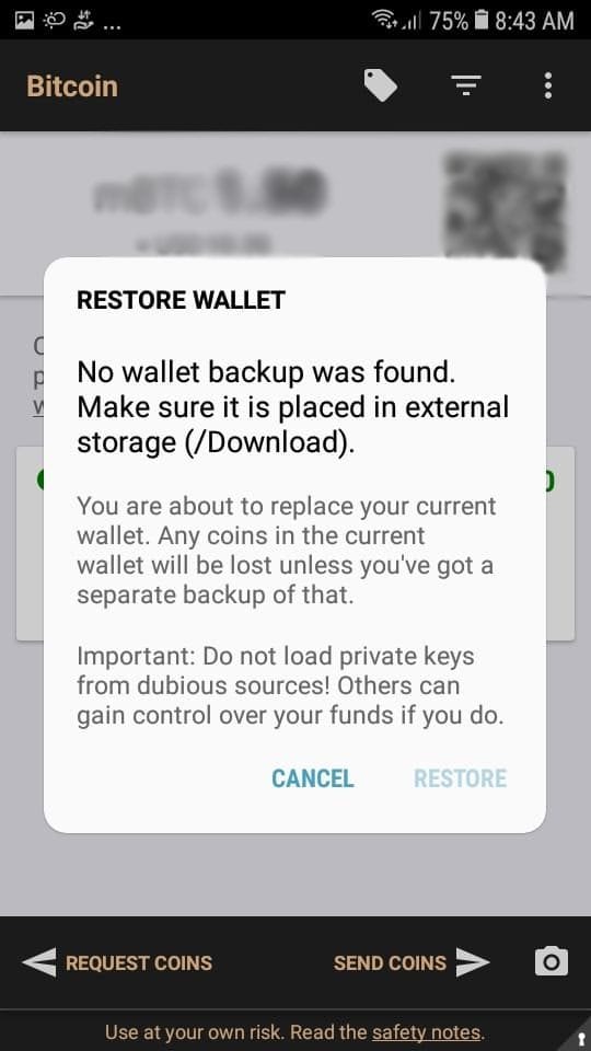 In this app, you can back up (and please do) your Bitcoin wallet by tapping the settings/options button in the top right corner of the app, tap ‘Safety’, and then tap ‘Back up wallet’. Follow the on-screen instructions to enter your password and select an external storage medium to save the wallet to. It needs to be external because phones get lost and stolen all the time, and your coins will go with it if that happens.