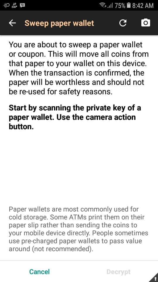 A paper wallet is just a piece of paper that a wallet’s private key is printed on. These are sometimes used by Bitcoin ATMs to dispense coins without having to send them to the buyer’s phone. They can also serve as ‘cold storage’ if you need to recover your wallet.