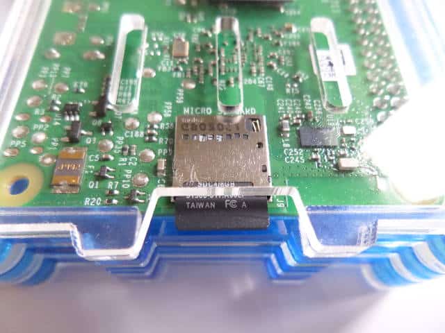 - When you’re finished, insert the microSD card into the Raspberry Pi as shown below, plug in an HDMI monitor or TV, plug one of the recommended power sources into the USB port, and then your Pi into a USB power source (like that AC adapter I mentioned). The Raspberry Pi 3 B doesn’t have an off switch, so it will turn on straight away when you plug it in.