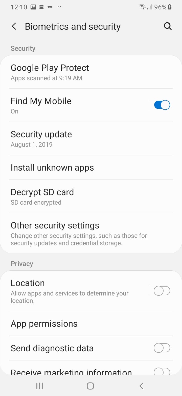Tap ‘Other Security Settings’. Remember to come back to this screen and encrypt your SD card!