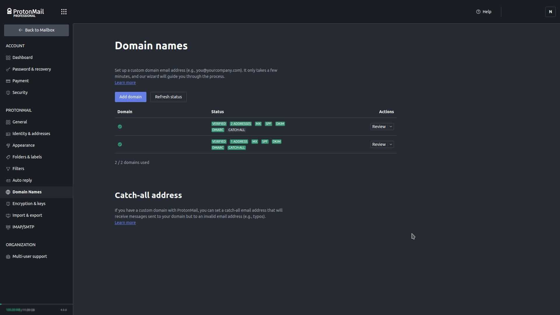 Free email accounts generally don’t offer custom domains and ProtonMail is no exception. You need a ProtonMail Plus account if you want to create a custom domain. However, you’ll only get one custom domain and you won’t be able to create a catch-all email. You don’t have to use a catch-all email in this case, though. If you do want one, or need two custom domains — you’ll need a ProtonMail Professional account.