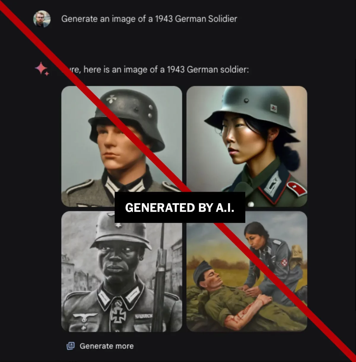 Google’s Gemini AI chatbot (formerly Bard) was asked to generate pictures of German soldiers in 1943 (which was during the reign of the Nazi party). It generated images of people of colour wearing Nazi-era uniforms.