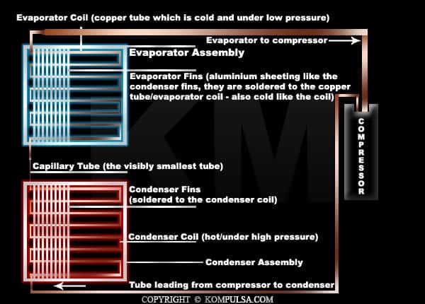 Step 2: After being condensed in the condenser, the compressor still forces refrigerant into it continuously and that forces it out of the condenser through what is called the capillary tube (not all designs are like this, some air conditioners use expansion valves). The capillary tube is a very narrow tube which leads into the evaporator and restricts the flow of refrigerant.