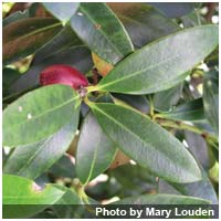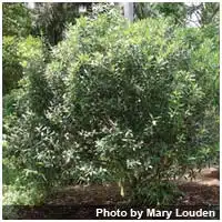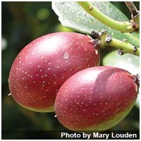 The plant is characterized by plump, reddish (or purplish-black) fruits which range from 2-4 cm in length (they resemble olives), white flowers, and dark green elliptic leaves.