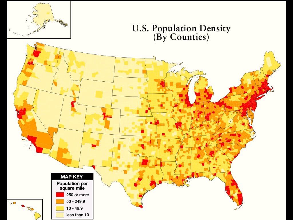 Look at the map below and you will see that almost all of the U.S has a population density of less than 50 persons per square mile (pale yellow and orange areas), and then look at Florida, it is actually in the top 4 states with the most red areas which have a high population density of more than 250 persons per square mile. The palest yellow areas are the largest fraction of the U.S and they have a population density of less than 10 people per square mile.