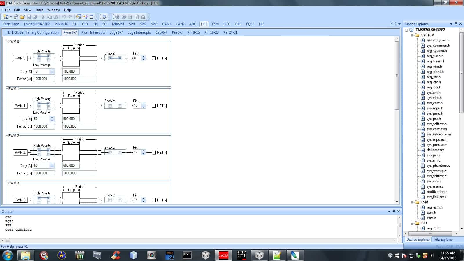 Before we get started, create a HALCoGen project (you can get HALCoGen from Texas Instruments’ website) and configure your PWM and HET settings. HET stands for ‘high-end timer’.