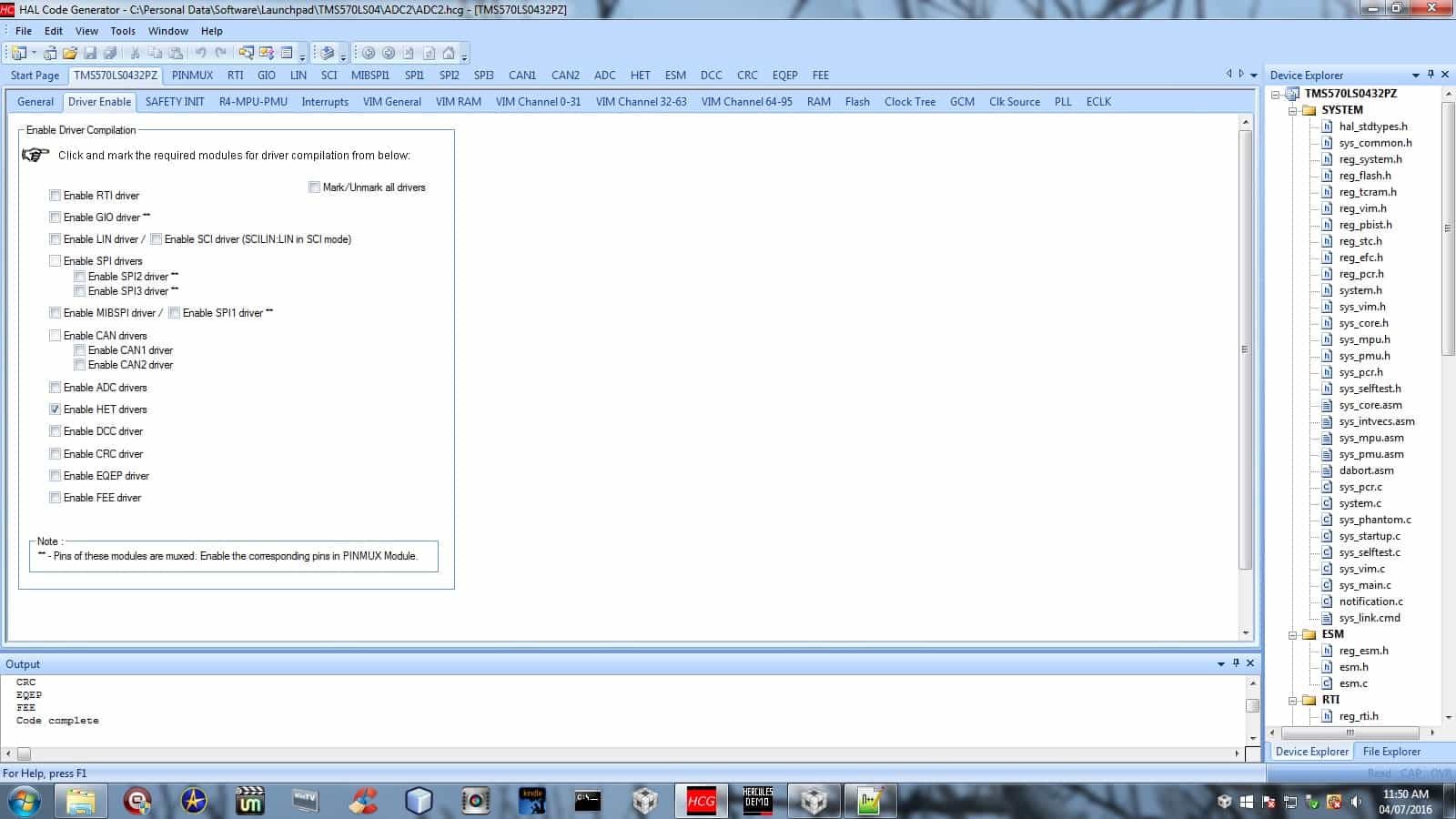 Afterwards, click the TMS570LS0432PZ tab, navigate to the Driver Enable subtab, and then tick the checkbox labelled ‘Enable HET drivers‘.