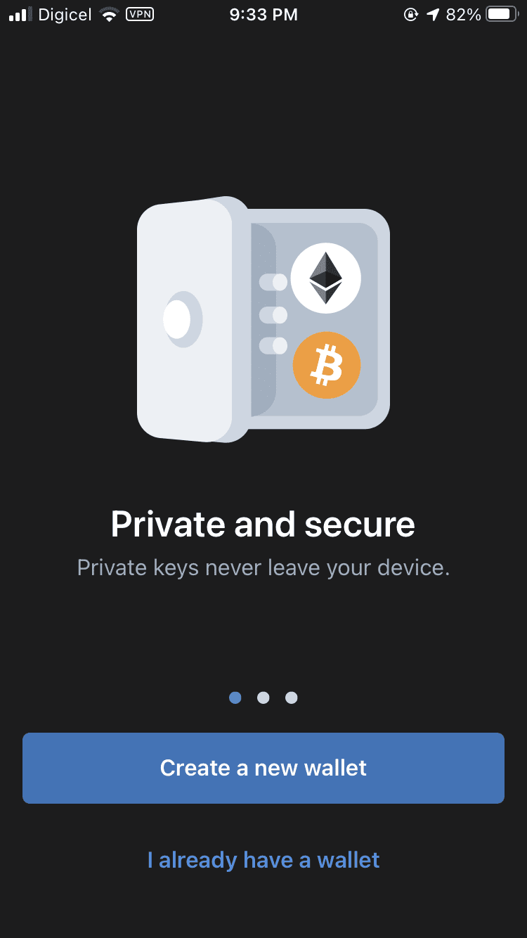 To create an Ethereum wallet on your phone with Trust Wallet, install and load it, and the first screen should have a ‘Create a new wallet‘ button.