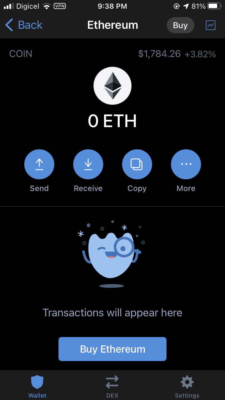 After clicking past the welcome screen, you should now see a list of wallets including Bitcoin, Ethereum, among others. Select Ethereum and you should see your Ethereum balance in ETH, as well as a ‘Send’, ‘Receive’, ‘Copy’ and ‘More’ button.