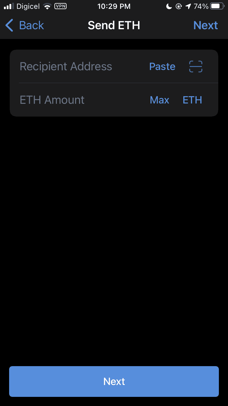 To send ETH, tap ‘Send’ and paste the recipient’s address in the ‘Recipient Address’ field, and the amount of ETH you’re sending in the ‘ETH Amount’ field.