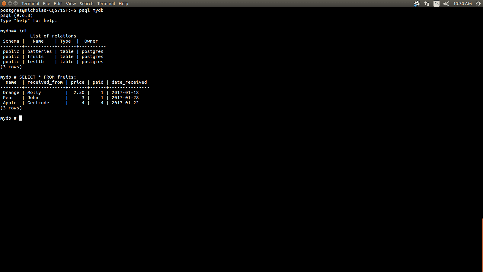 This wouldn’t be a good PostgreSQL tutorial without practice, now would it? Create a new table in your database called fruits. Include the fields name, received_from, price, and date_received. Remember, you don’t need to use quotes for the table or field names unless they contain uppercase letters. The price field will be of the ‘numeric’ data type because cents may be involved.