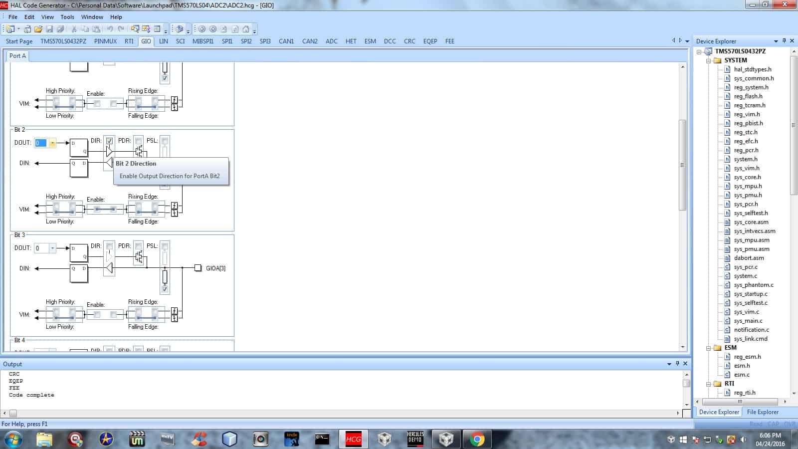 Setting bit 2 to the ‘output direction’ just means that it is going to write to that bit instead of reading from it. To turn it on, we will simply set the bit’s value to 1. To a computer, 1 means on, and 0 means off. The DOUT dropdown box is there so that you can have HALCoGen generate the code to turn it on for you, but we’ll leave it off (DOUT: 0) for now because we want to turn that LED on only when we press the button connected to GIOA7.
