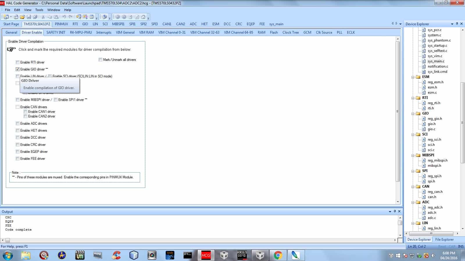 First, create a HALCoGen project. Go to File > New > Project, and select the TMS570LS04x MCU. You’ll see two options: The TMS570LS04x and it’s FreeRTOS equivalent. For this tutorial, we will select the first option, TMS570LS04x and choose an appropriate directory. Proceed to the tab corresponding to your MCU’s model number (TMS570LS0432PZ in my case). Select Enable GIO driver, as shown below.