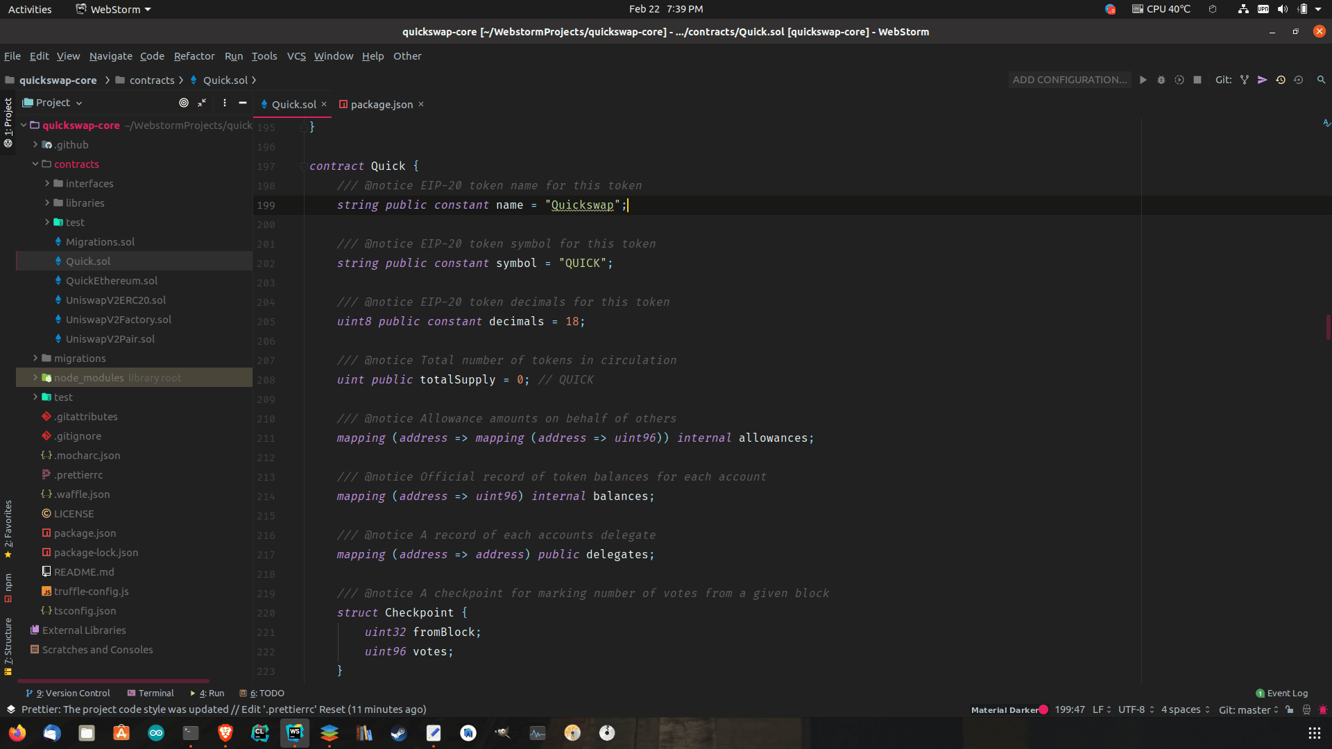 The image above is a small portion of QuickSwap’s source code — more specifically the smart contract named ‘Quick’. There are several other smart contracts, which perform various functions. QuickSwap is written primarily in the Solidity programming language and Typescript (a JavaScript-like language). Solidity is the language used to write Ethereum smart contracts.